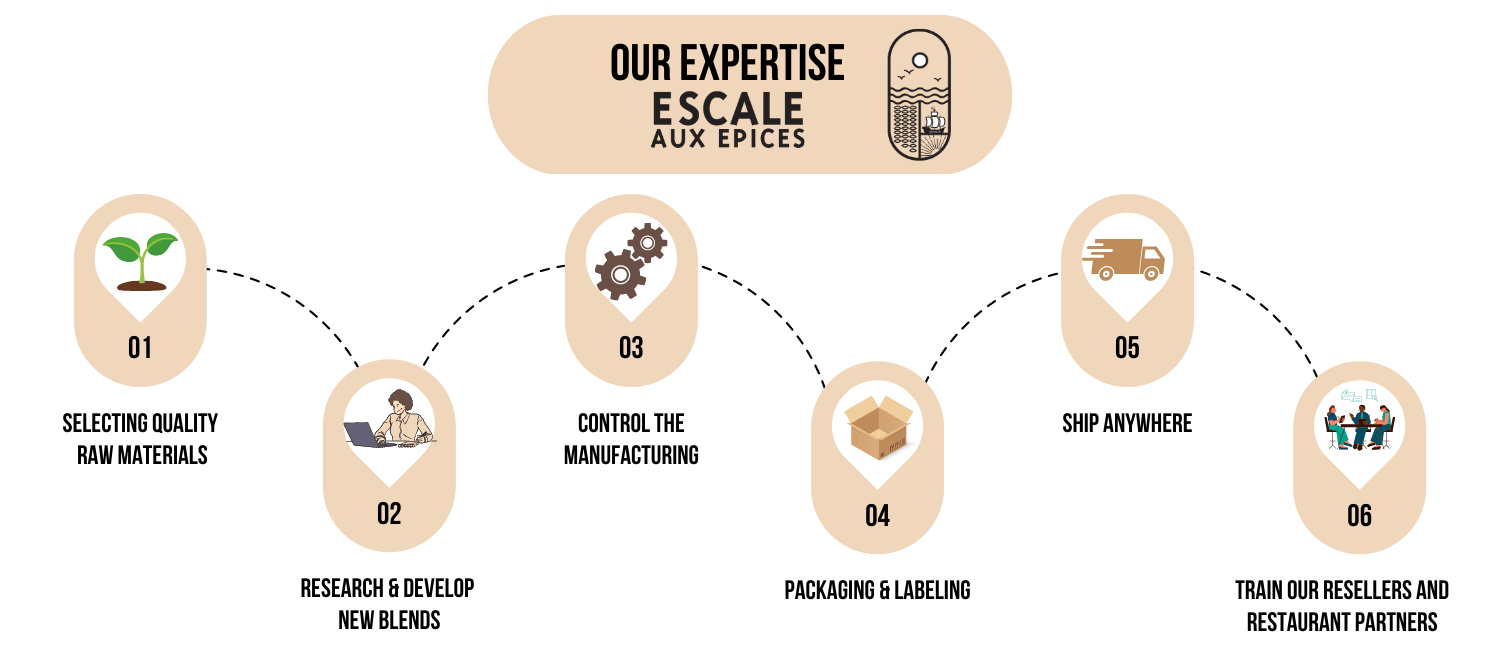 With Escale Aux Épices, we make sure that our raw materials come from quality sources, from small producers with as few intermediaries as possible. We attach great importance to our assembly process to best meet the needs of our professional customers, reseller partners or restaurant owners.